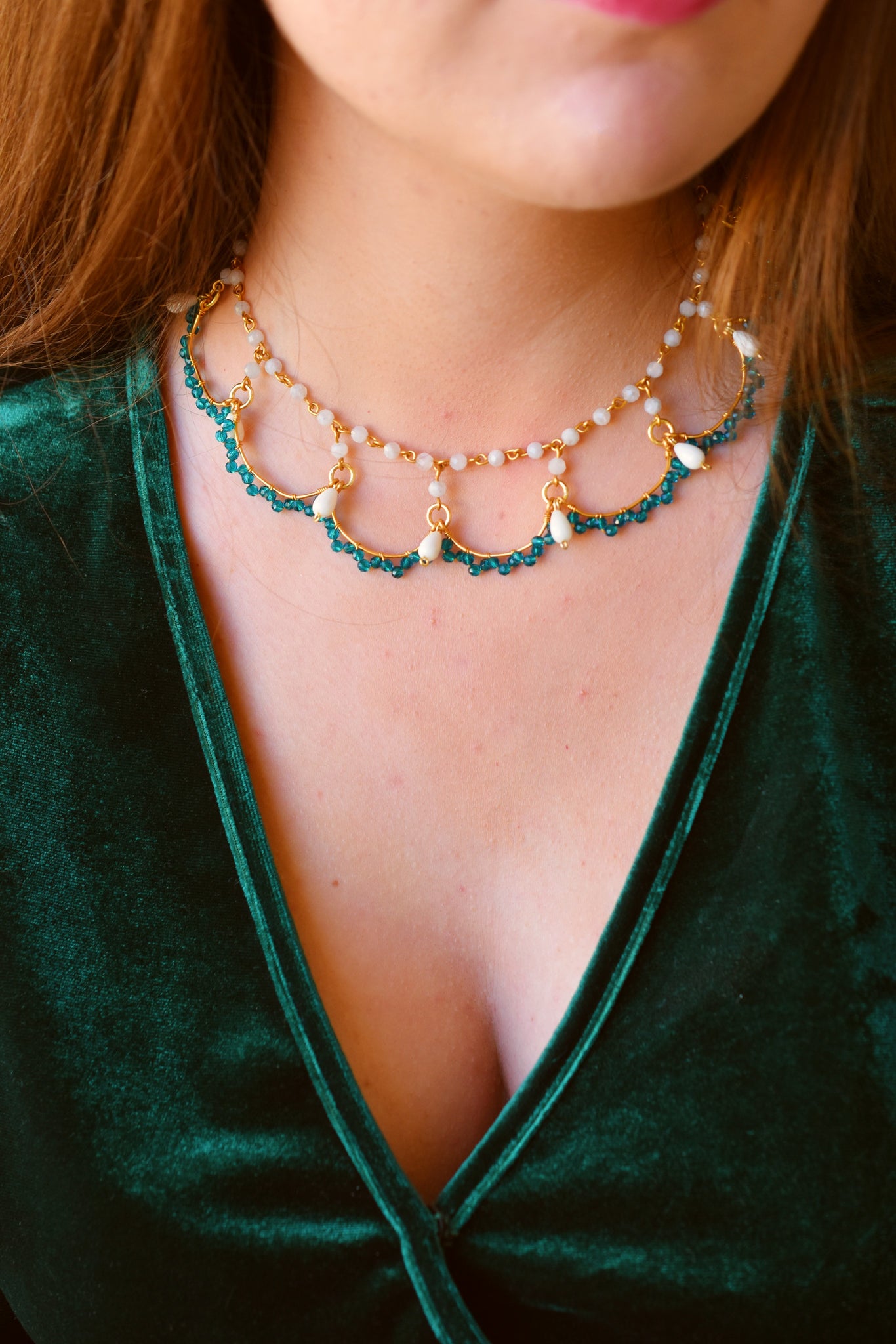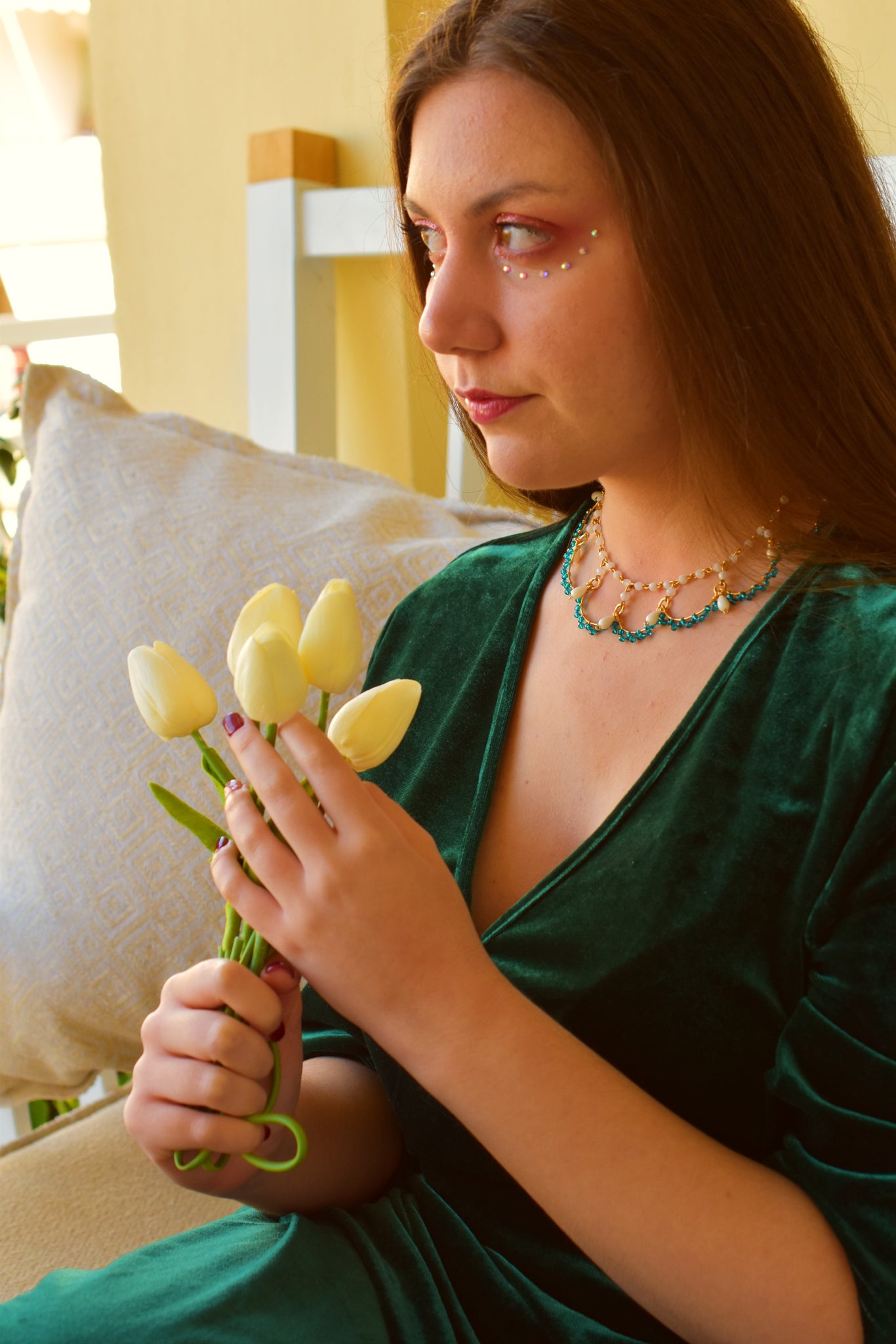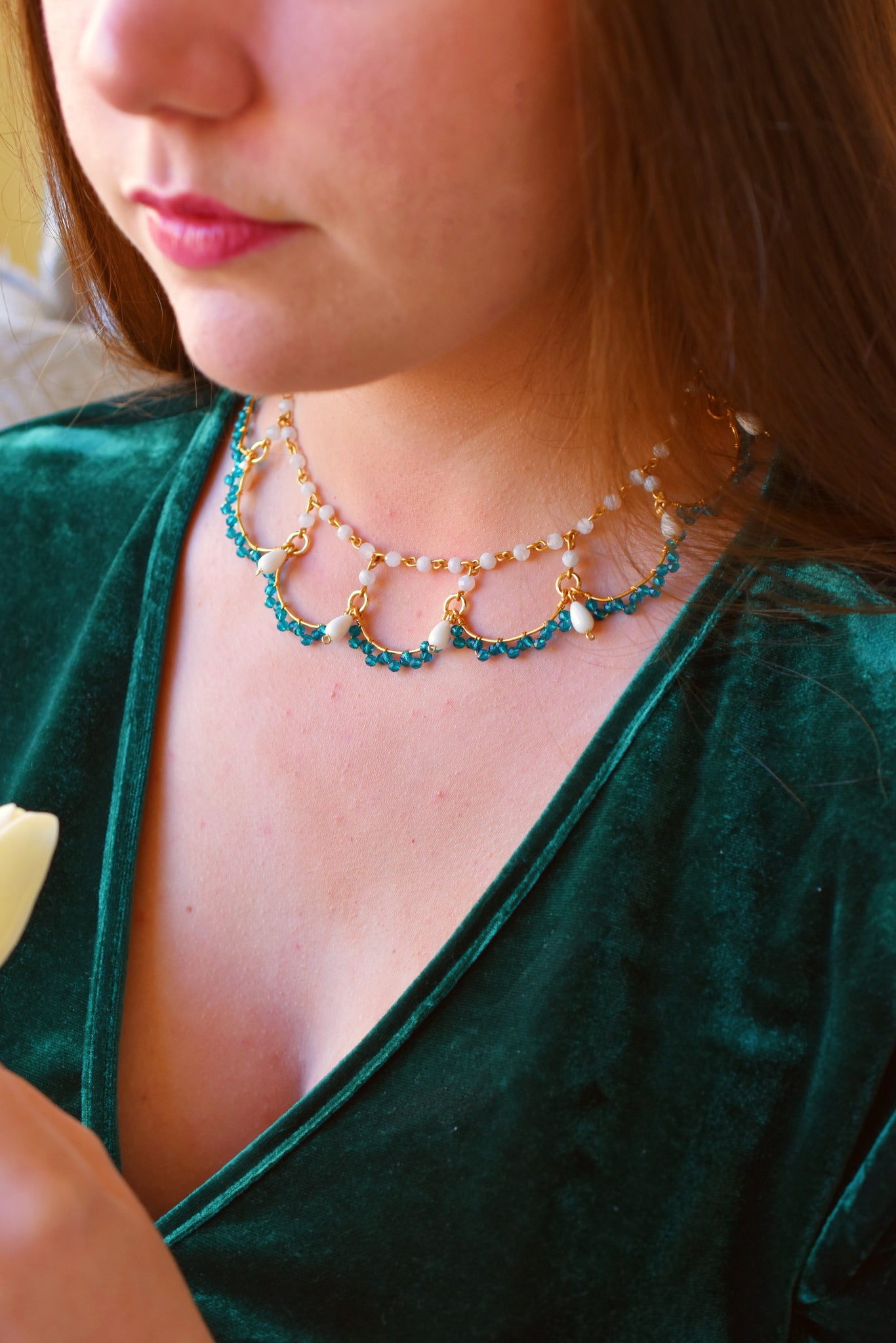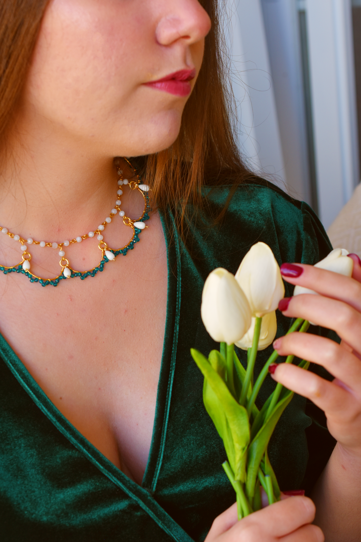 - Πέτρες: Λευκές φεγγαρόπετρες, τουρκουάζ κρύσταλλοι (γαλαζοπράσινο χρώμα), λευκό κοράλλι (σταγόνες)