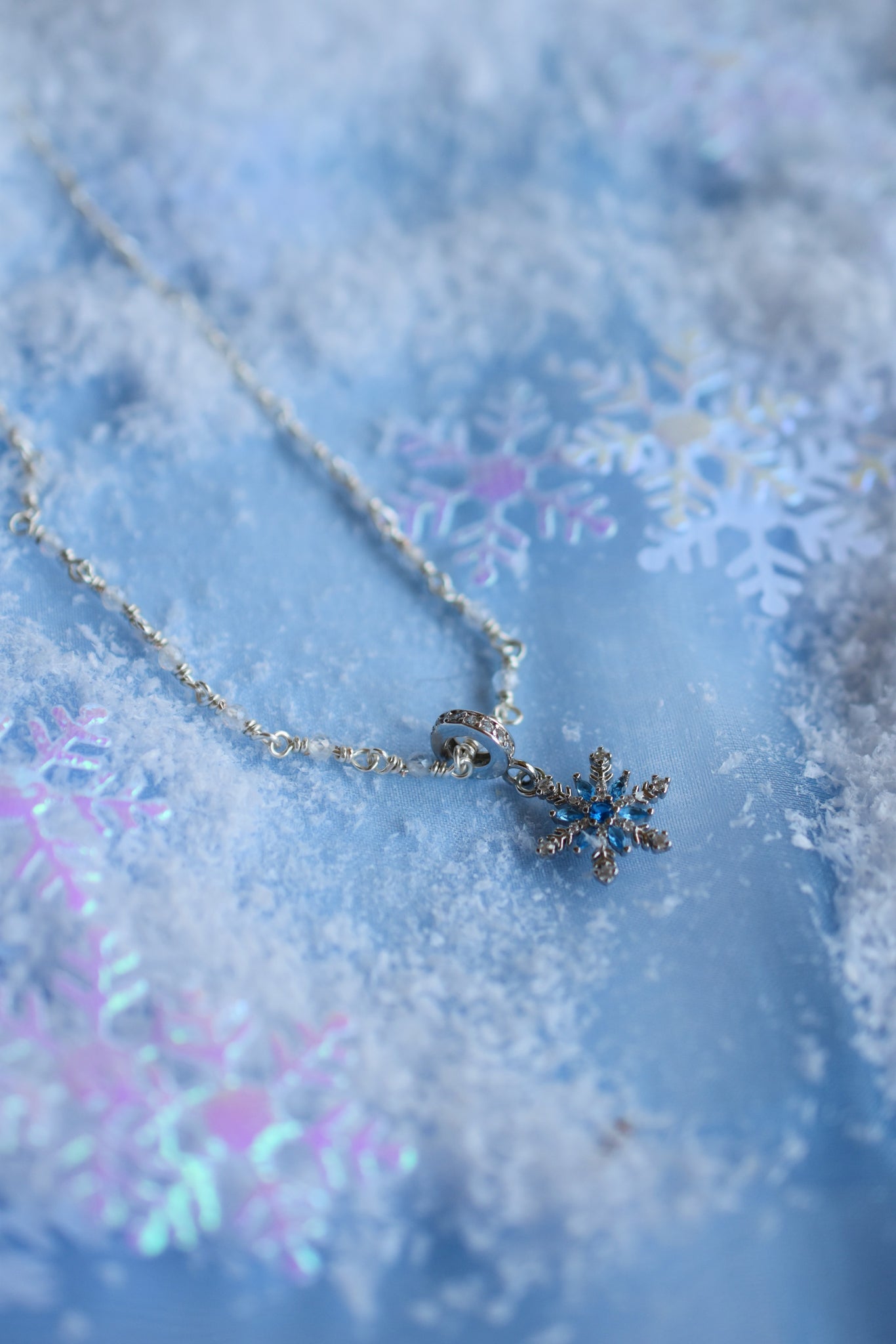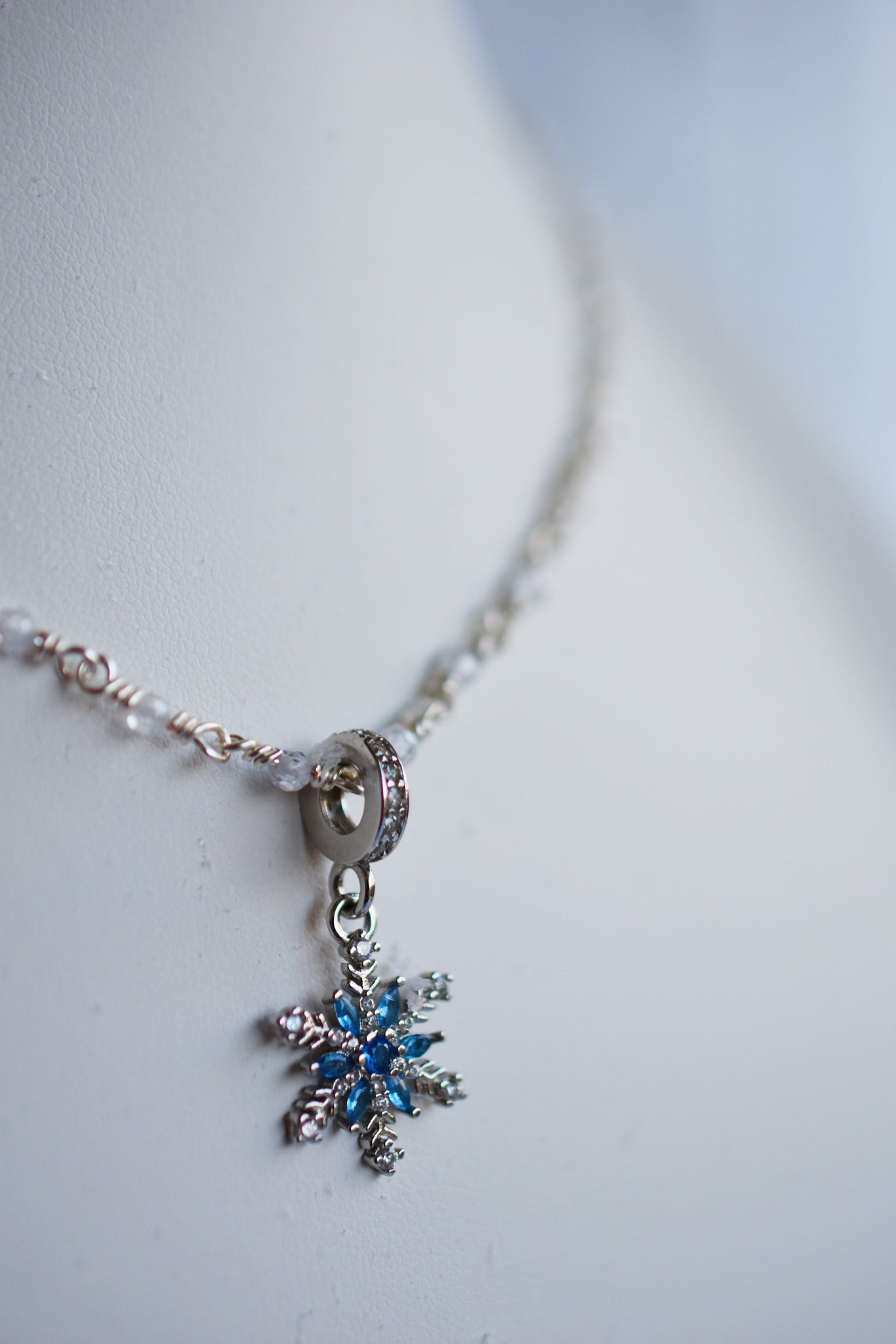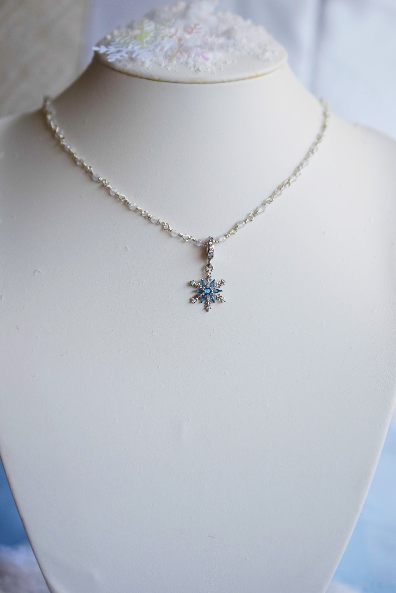 - Υλικά: επάργυρο σύρμα-αλυσίδα ροζάριο πλεγμένη στο χέρι, κρεμαστό χιονονιφάδα ασημένιο 925