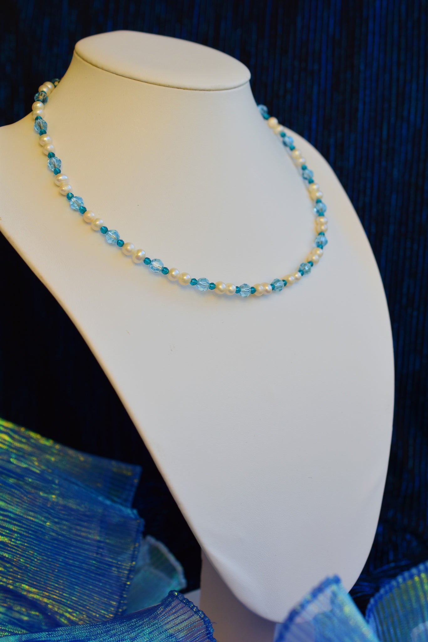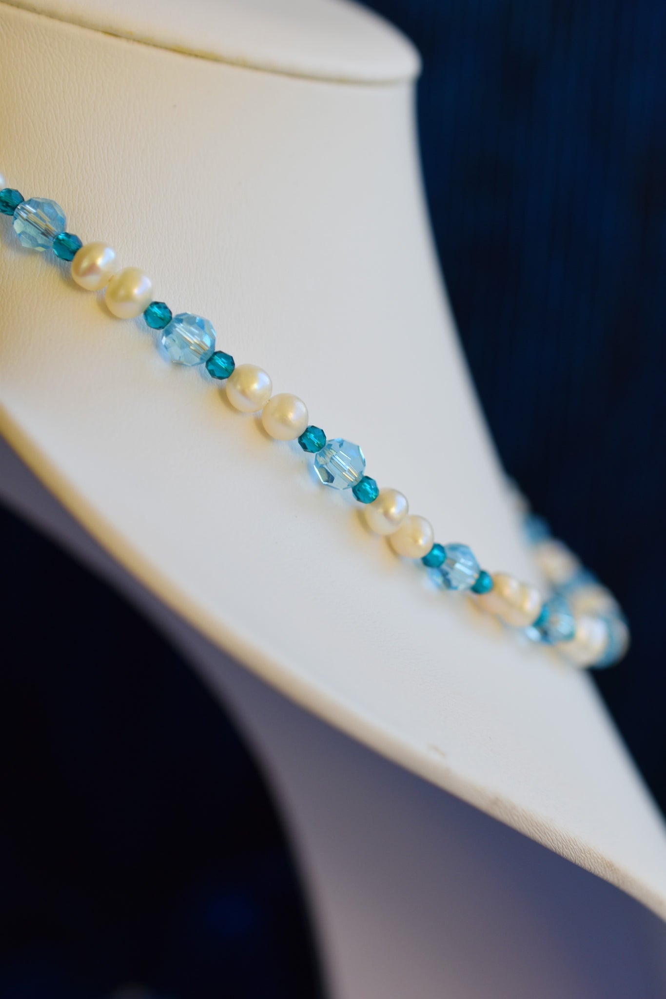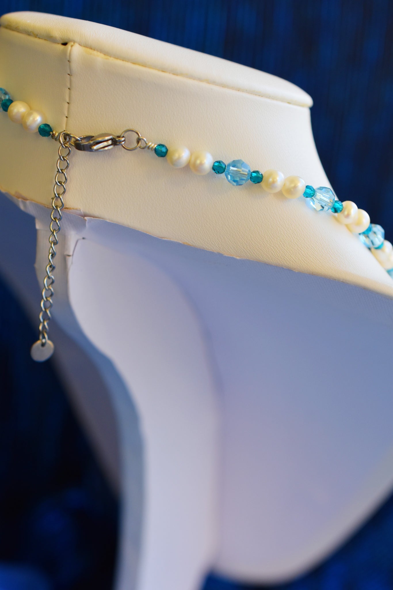 • Πέτρες: λευκά μαργαριτάρια, μπλε swarovski, γαλαζοπράσινο κρύσταλλο