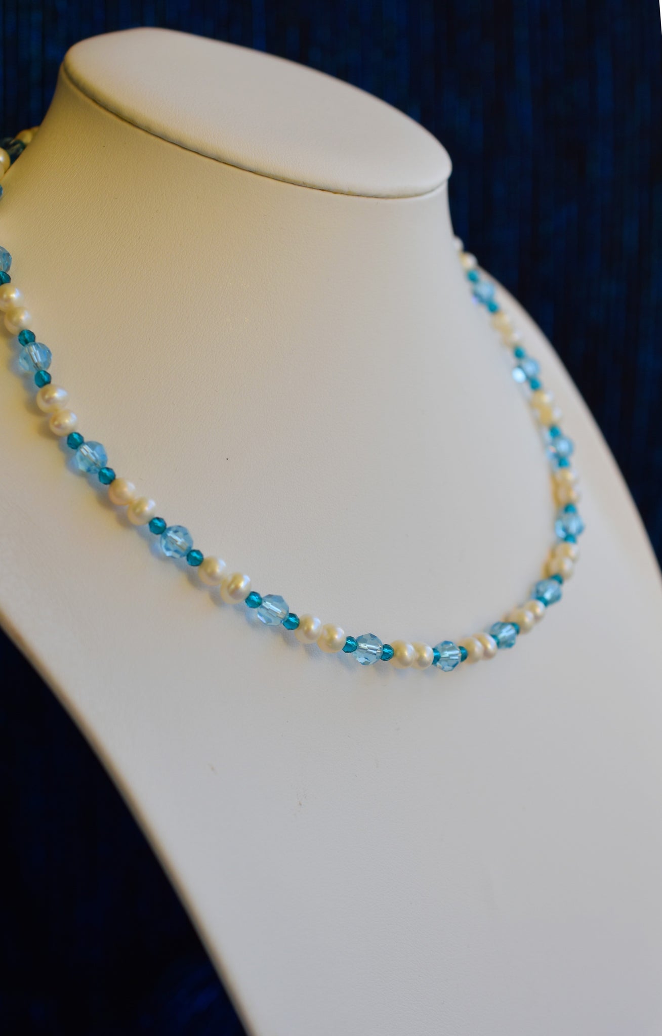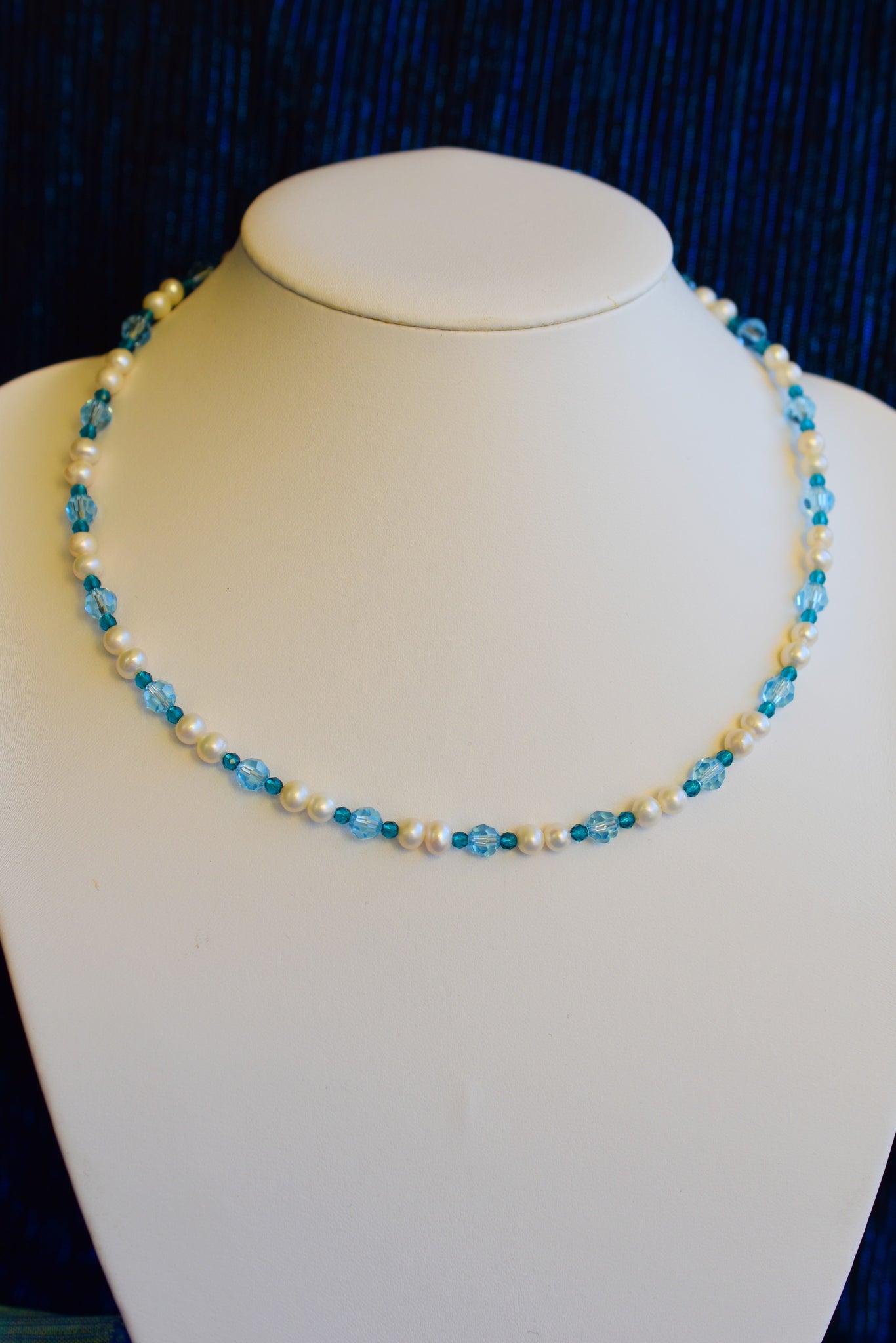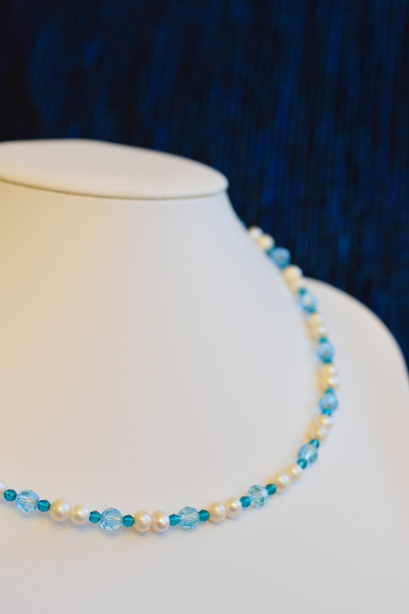 • Πέτρες: λευκά μαργαριτάρια, μπλε swarovski, γαλαζοπράσινο κρύσταλλο